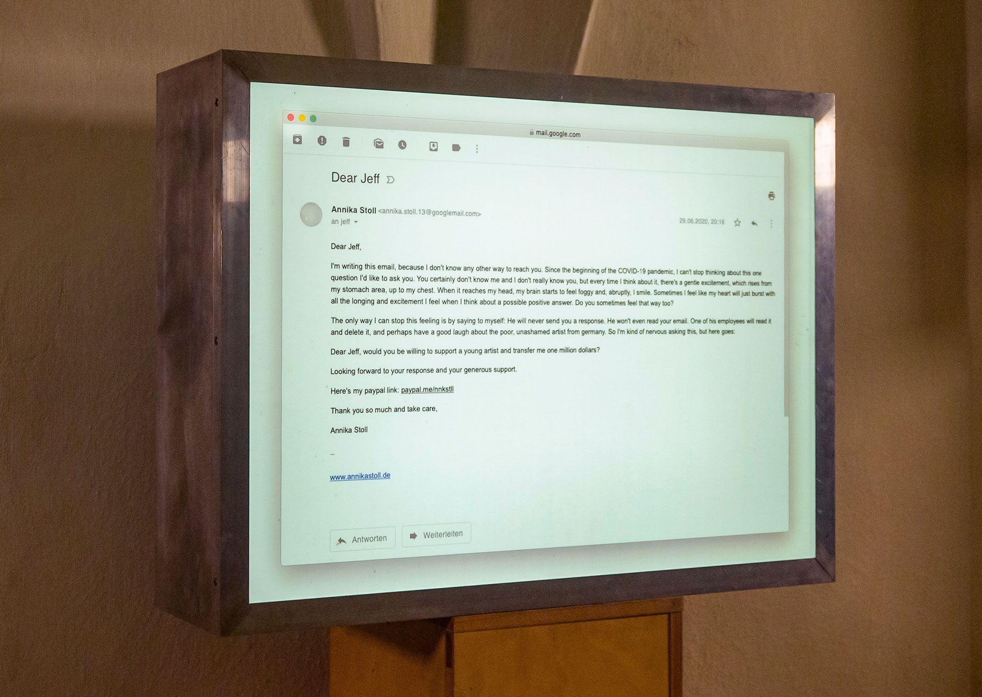 Um Umverteilung geht es auch in dem Werk „Dear Jeff“ von Annika Stoll. Die in einem Leuchtkasten präsentierte Arbeit ist der Screenshot einer E-Mail von ihr an Jeff Bezos, den Gründer und CEO des Online-Versandhandels Amazon. Der Text in Form eines Liebesbriefes beinhaltet die Bitte der Künstlerin, ihr eine Million Dollar zu überweisen.