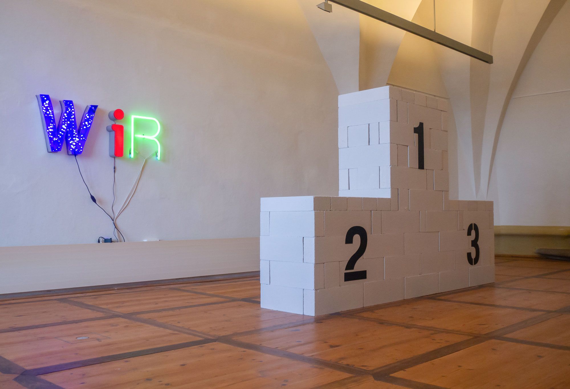 Der Schriftzug „WIR“ erstrahlt in Leuchtbuchstaben blau, rotund grün. Sie entstammen unterschiedlichen Kontexten, verschiedener Herkunft. Dazu steht ein hochgemauertes Siegerpodest als Teil dieser Installation. Das „Wir“ wird gesellschaftlich immer wieder eingefordert und ist leider kaum durchführbar oder denkbar ohne die sofort stattfindende Kontamination durch irgendeinen Wettbewerb.