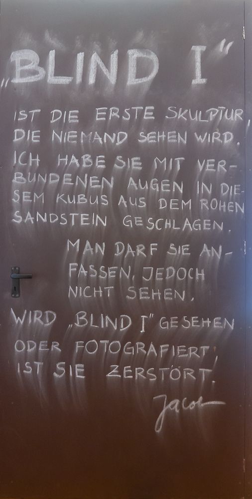 Kunst muss ihre eigenen Gesetze machen, ihre eigenen Regeln aufstellen. Mit seinem Werk "Blind1" nennt der Künstler Rainer Jacob die Bedingungen für die Entdeckung seiner Skulptur und liefert zugleich den Raum, für den diese Gesetze gelten.