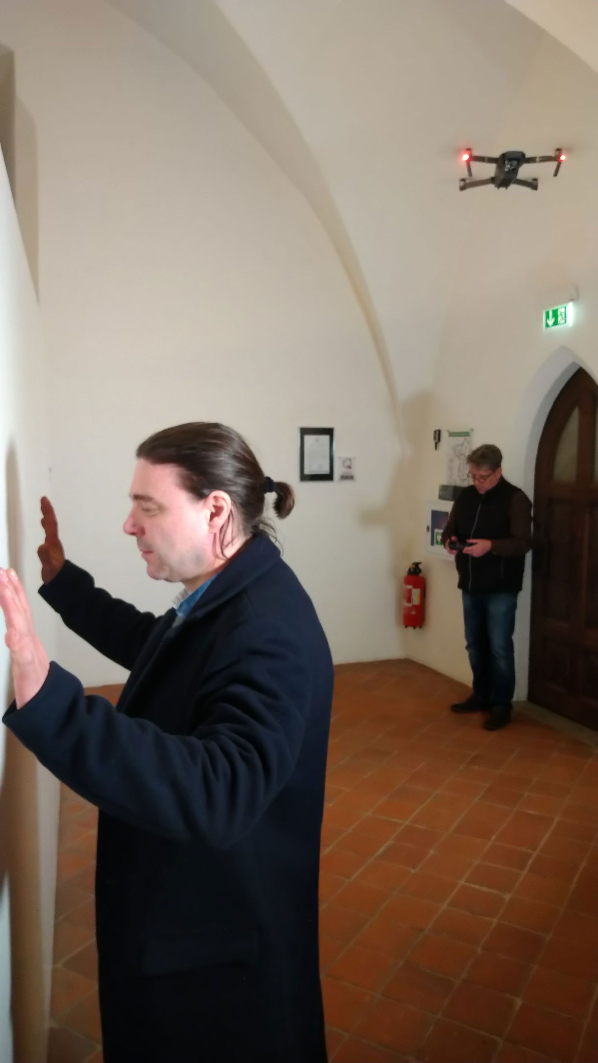 Über mehrere Stunden arbeiten wir uns von Raum zu Raum, nachdem wir auf dem Platz zu Fuße des Doms die Außenaufnahmen angedreht hatten. Wir, dass sind Dirk als darstellender Kurator, Hendrik mit seiner Drohne und Frank als Kameramann, Licht- und Tonassistent.